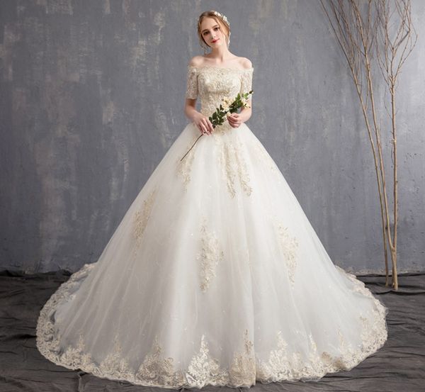 New 2019 Princess Wedding Dresses Gold Appliques White Satin Inside Elegant Bride Gowns Hot Off The Shoulder Lace Wedding Dresses Wedding Dresses For