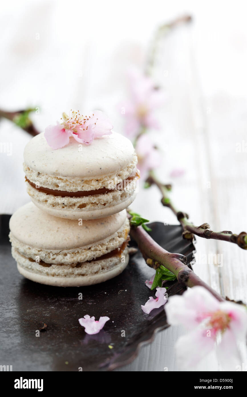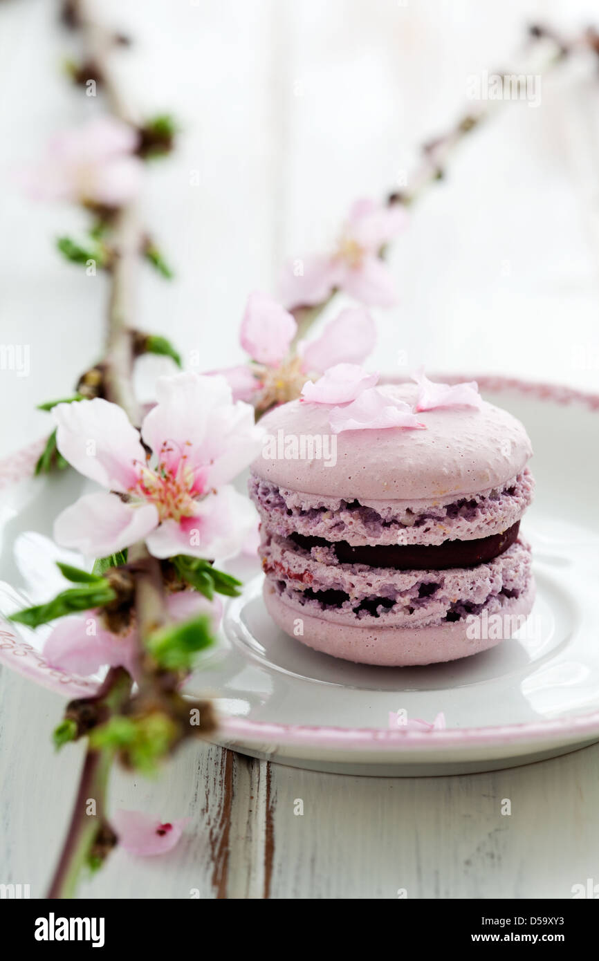 French Macaroons Decorated With Pink Cherry Flowers Stock Photo