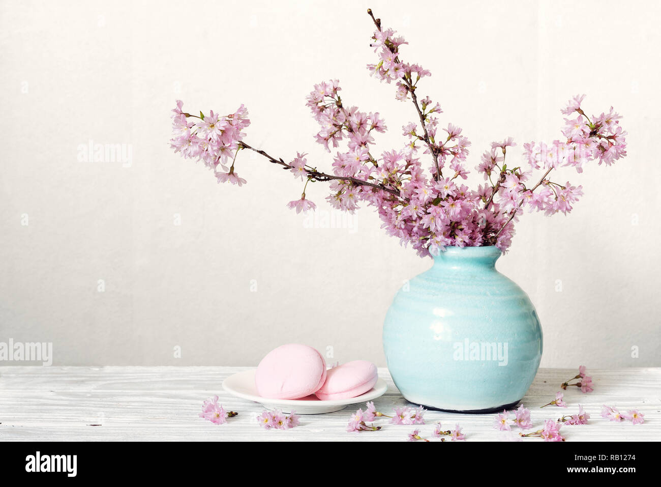 Pink Cherry Blossom Flower Bouquet With Macarons In Blue Vintage