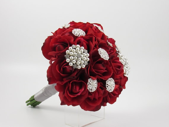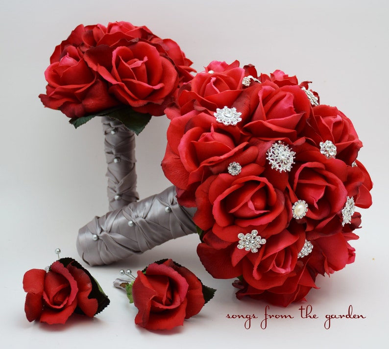 Red Roses Rhinestones Bridal Bouquet Real Touch Bridal Bouquet Roses Bridesmaid Bouquet Groom Groomsman Boutonniere Red Grey Wedding