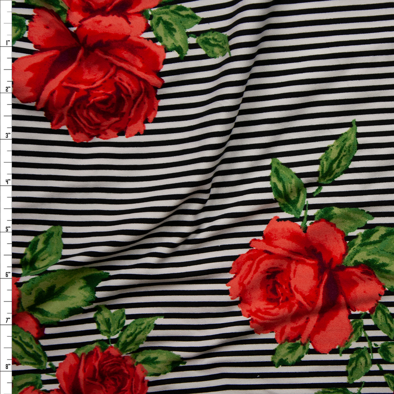Red Roses On Black And White Stripes Double Brushed Poly Spandex Knit